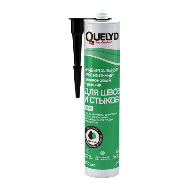 Однокомпонентный Quelyd универсальный нейтральный силиконовый герметик ДЛЯ швов И стыков белого цвета. Отверждается за счет реакции с влагой воздуха.