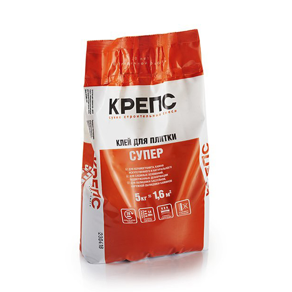 Клей для плитки Крепс «Супер», 5 кг — сухая строительная смесь, состоящая из цемента, мелкозернистого фракционированного песка, модифицированная специальными добавками, в том числе полимерными. После затворения водой образует пластичную растворную смесь с высокой устойчивостью к сползанию.