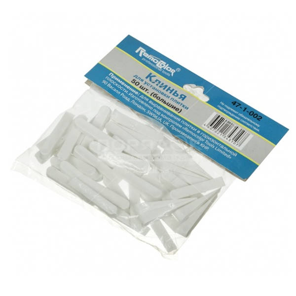 Предназначены для выравнивания керамической плитки относительно поверхности и обеспечения одинаковой ширины межплиточных швов. Их использование особенно эффективно при неровных стенах и больших перепадах в укладочных швах. Размер клиньев выбирается в зависимости от типа отделочных работ, от тяжести и габаритов плиточных материалов. После полного высыхания раствора клинья вынимают, а швы замазывают специальной затиркой.