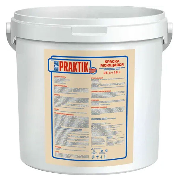 Краска моющаяся водно-дисперсионная поликриловая предназначена для окрашивания стен и потолков внутри помещений с нормальной и повышенной влажностью (кухни, ванные, коридоры). Для стен и потолков, требующих стойкости к мытью.