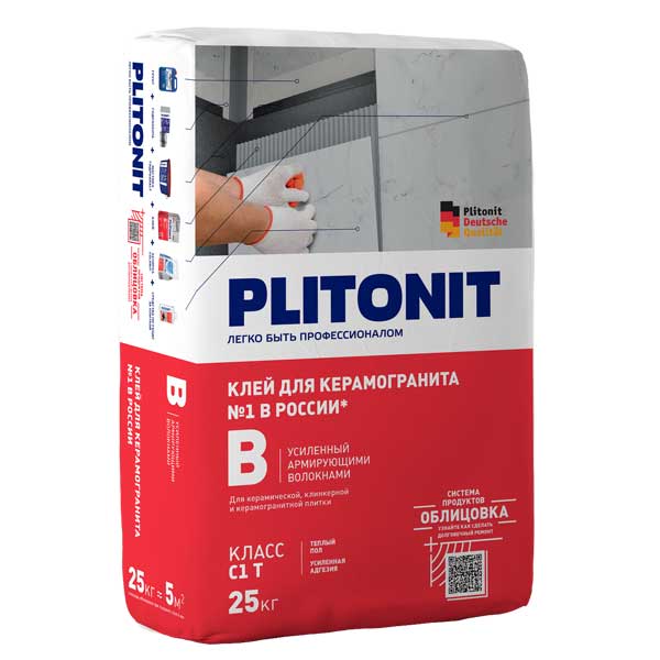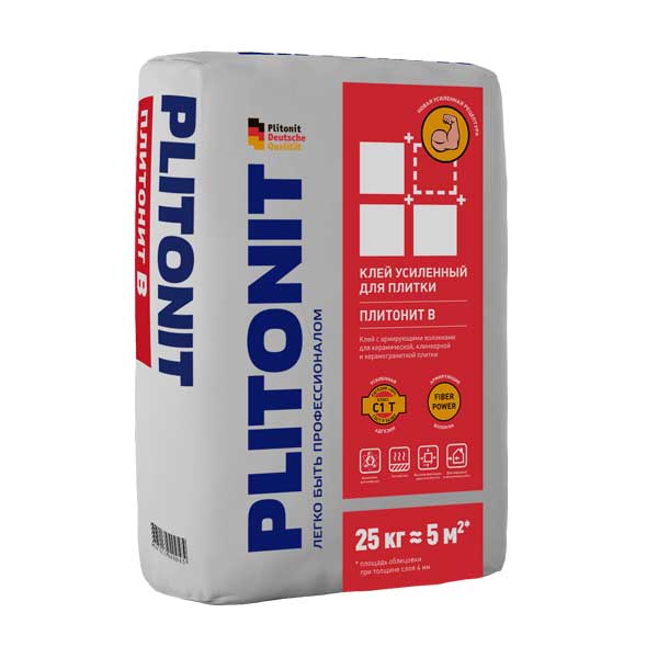 Плитонит В — это клей усиленный с армирующими волокнами, С1 ГОСТ Р 56387-2015, для керамической плитки и напольной керамогранитной, клинкерной плитки. Удобен в применении, легко перемешивается с водой, обладает высокой пластичностью, в процессе производства работ плитка не сползает с вертикальных оснований.