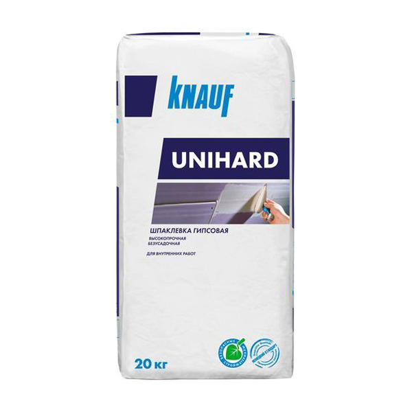 КНАУФ-Унихард — гипсовая высокопрочная безусадочная шпаклевка предназначена для заделки стыков гипсокартонных и гипсоволокнистых листов, а также сплошного шпаклевания гипсовых пазогребневых плит, бетонных и оштукатуренных поверхностей и заделки дефектов гипсовых, цементных и бетонных поверхностей.