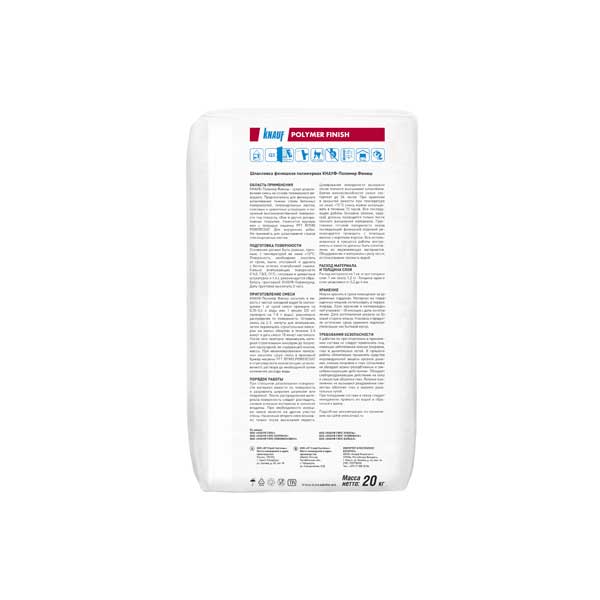 Финишная полимерная шпаклевка КНАУФ-Полимер Финиш на основе полимерного вяжущего белого цвета. Применяется внутри помещений для финишного шпаклевания тонким слоем бетонных поверхностей, гипсокартонных и гипсоволокнистых листов, гипсовых и цементных штукатурок и получения поверхности под покраску, обои и другие декоративные покрытия. Обладает высокой адгезией, пластичностью и трещиностойкостью. Отлично подходит для выравнивания слоем 0,2 до 4 мм. Благодаря микроволокнам не дает усадки. После затворения водой сохраняет рабочие свойства в течение 72 часов.