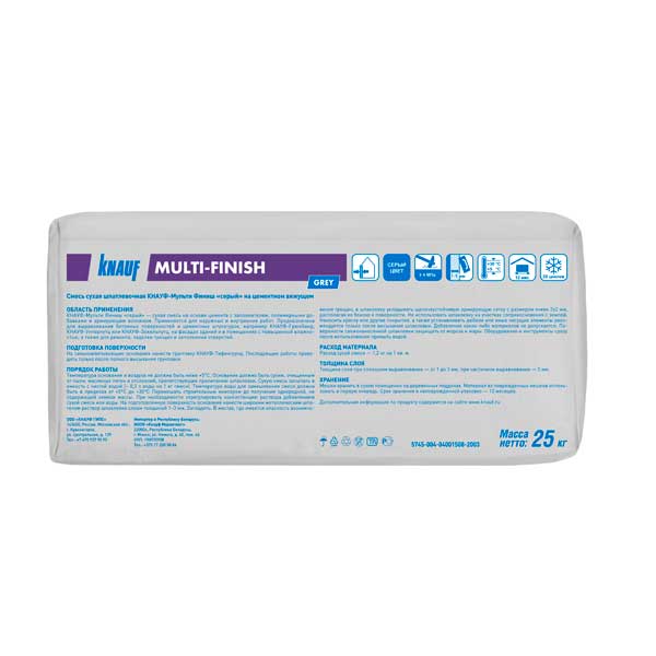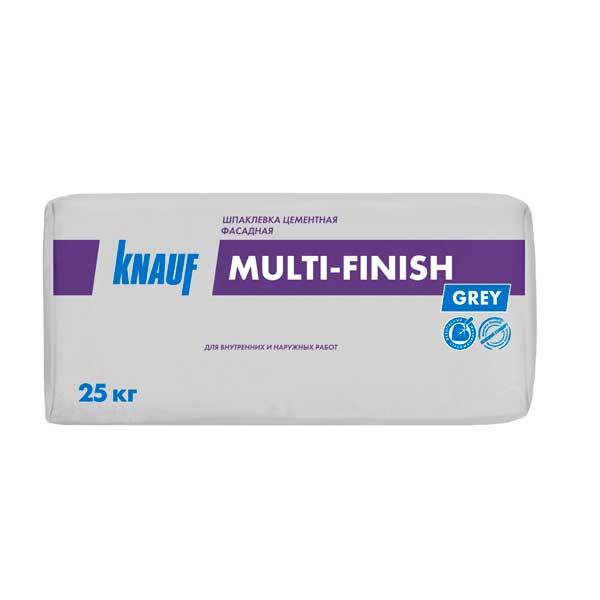 Шпаклёвка КНАУФ Мульти-финиш «серый» на основе цемента с заполнителем и полимерными добавками и армирующим волокном. Применяется для наружных и внутренних работ. Шпаклёвка предназначена для выравнивания поверхностей бетона и цементных штукатурок, например, КНАУФ-Грюнбанд, КНАУФ-Унтерпутц и КНАУФ-Зокельпутц на фасадах зданий и в помещениях с повышенной влажностью, для ремонта, заделки трещин, заполнения отверстий.