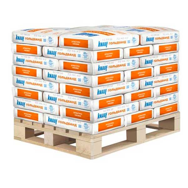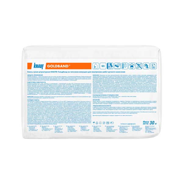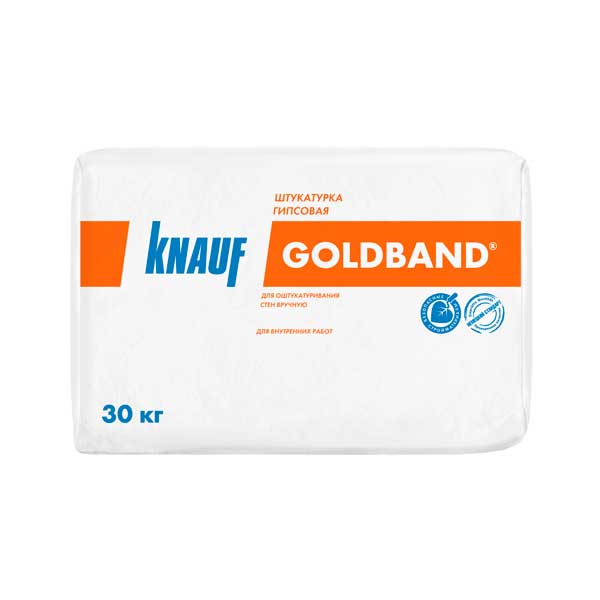 Штукатурка гипсовая КНАУФ-Гольдбанд — это сухая штукатурная смесь на основе гипса с полимерными добавками предназначена для высококачественного ручного оштукатуривания стен с твёрдым и прочным основанием (кирпичная кладка, цементная штукатурка, плотный и пористый бетон), поверхностей из пенополистирола и ЦСП внутри помещений с нормальной влажностью, включая кухни и ванные комнаты с покрытием, обеспечивающим защиту от увлажнения. Подходит для создания высококачественной отделки поверхностей в короткие сроки. Только для внутренних работ.