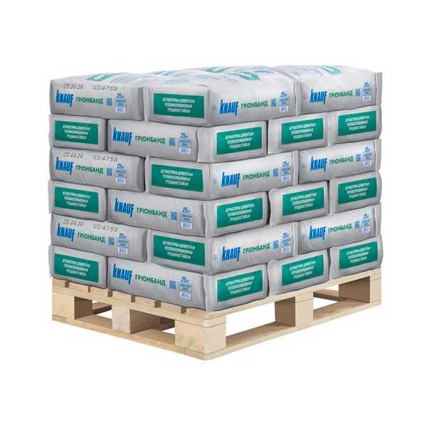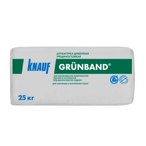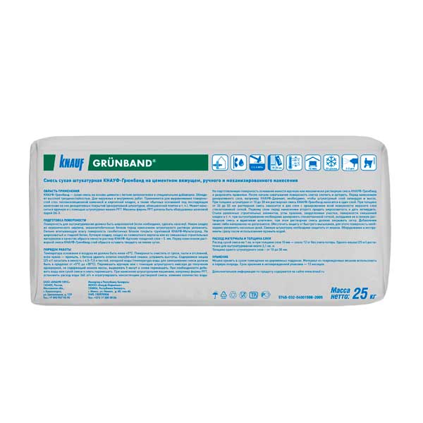 КНАУФ-Грюнбанд – штукатурка цементная фасадная, трещиностойкая с водоотталкивающими свойствами на основе цемента, фракционированного песка, лёгкого заполнителя – гранул пенополистирола и добавок, в том числе гидрофобных. Предназначена для оштукатуривания поверхностей фасадов зданий, стен и потолков во влажных помещениях, оснований из керамического и силикатного кирпича, бетона, газо-, пено-, керамзитобетонных блоков под последующее нанесение на них декоративных покрытий (например, декоративной штукатурки КНАУФ-Диамант, краски, облицовочной плитки и т.п.).